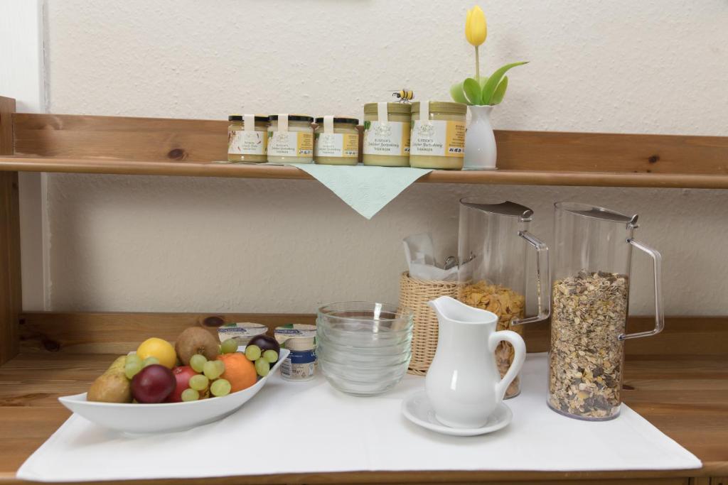 A selection of options including fruits, juice and cheese is served for the continental breakfast.