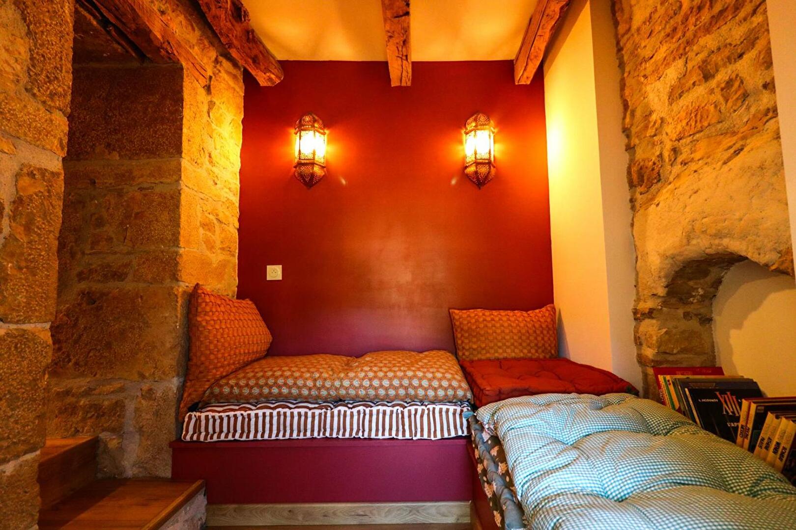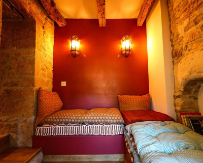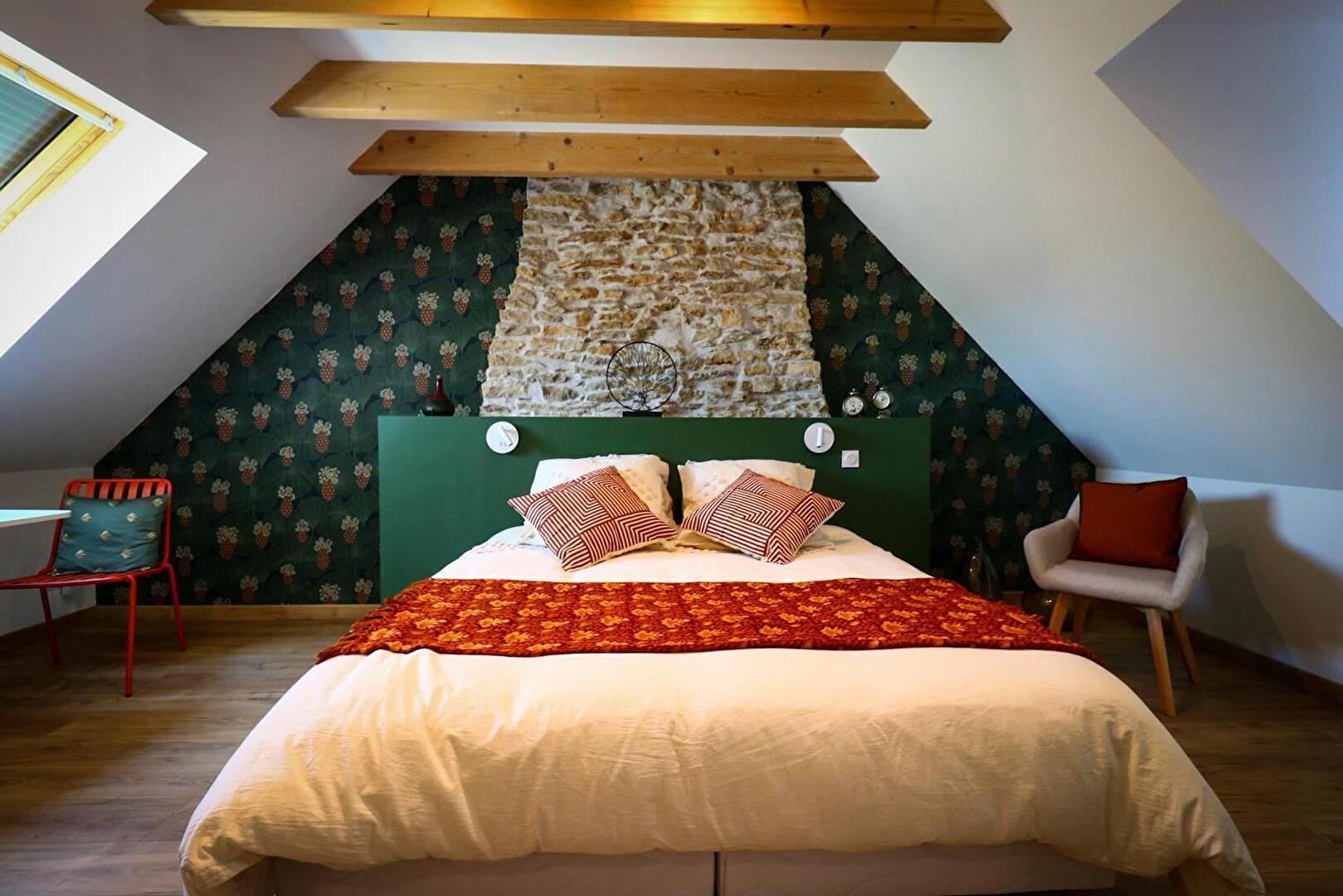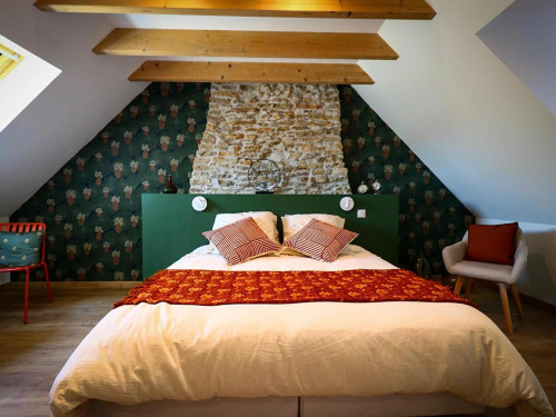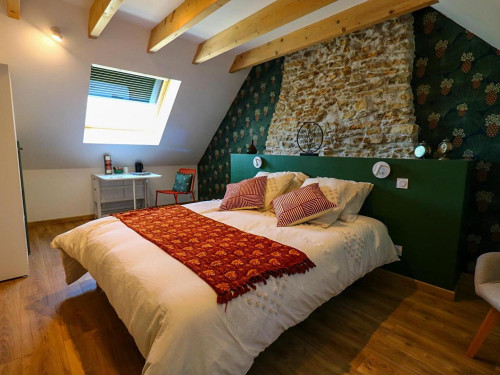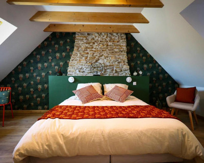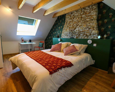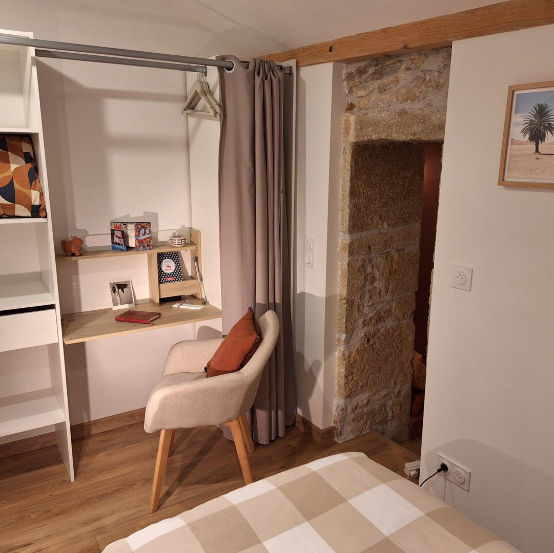 La Chambre d'hôte se trouve à l'étage d'une maison en pierre. Vous disposez d'un pallié privatif constituant une suite familiale : 1 chambre séparée avec 1 lit 160x200 (22m²) avec TV et bureau, 1 autre chambre indépendante avec 1 lit 90x200 (10m²) et une espace attenante dans notre pigeonnier avec lit pour enfant 185x90 (suppl. +20 €/nuit) 1 salle d'eau avec douche à l'italienne, WC, lave-linge, sèche-linge et sèche-cheveux.