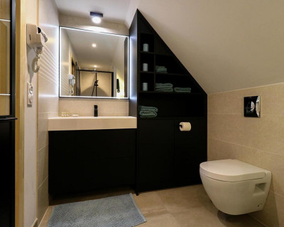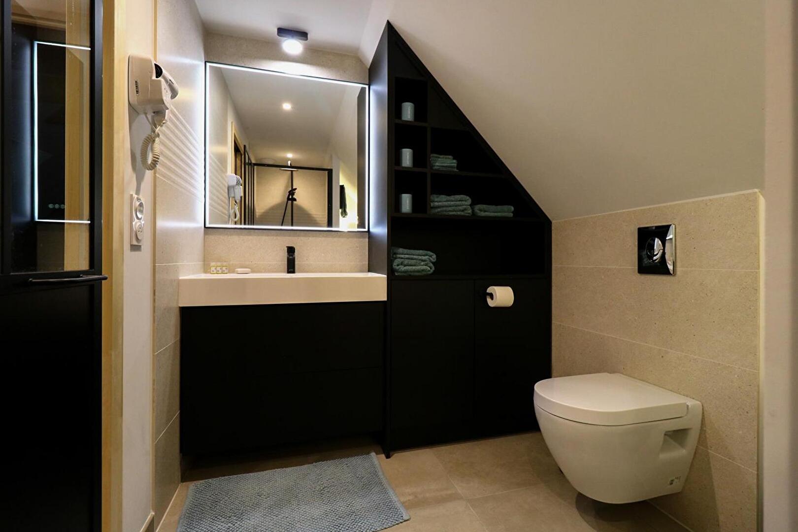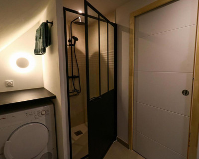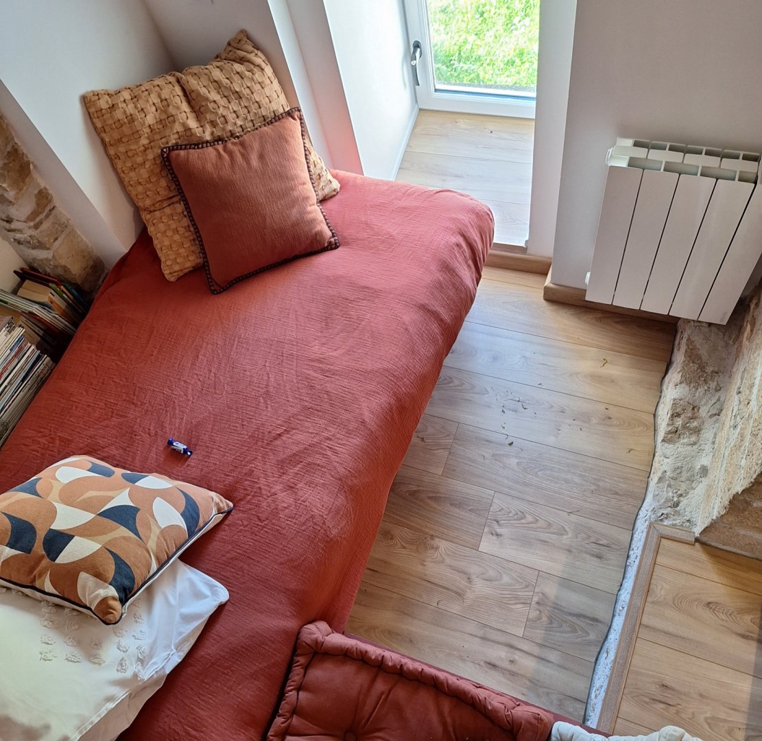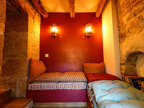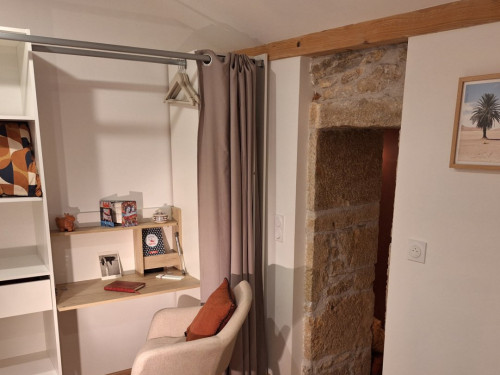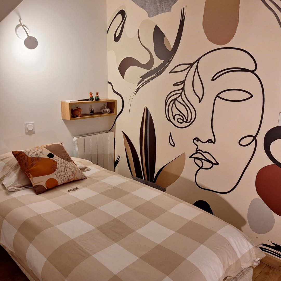 La Chambre d'hôte se trouve à l'étage d'une maison en pierre. Vous disposez d'un pallié privatif constituant une suite familiale : 1 chambre séparée avec 1 lit 160x200 (22m²) avec TV et bureau, 1 autre chambre indépendante avec 1 lit 90x200 (10m²) et une espace attenante dans notre pigeonnier avec lit pour enfant 185x90 (suppl. +20 €/nuit) 1 salle d'eau avec douche à l'italienne, WC, lave-linge, sèche-linge et sèche-cheveux.