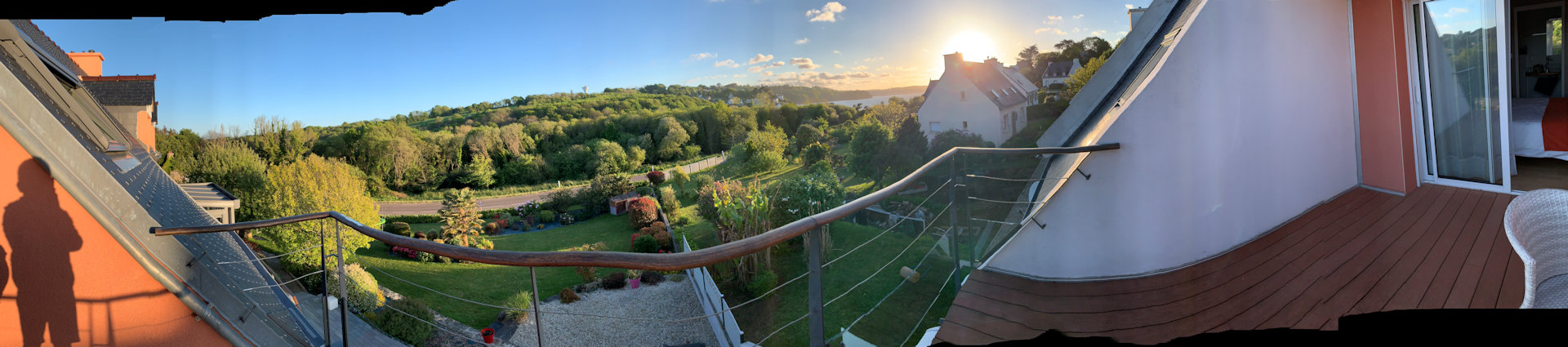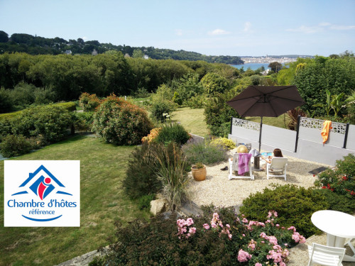 Terrasse privative avec vue magnifique sur jardin paysager et baie de Douarnenez.