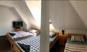 The triple room offers a wardrobe and a carpeted floor, as well as a private bathroom featuring a shower. This triple room features heating and a flat-screen TV. The unit offers 3 beds.