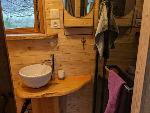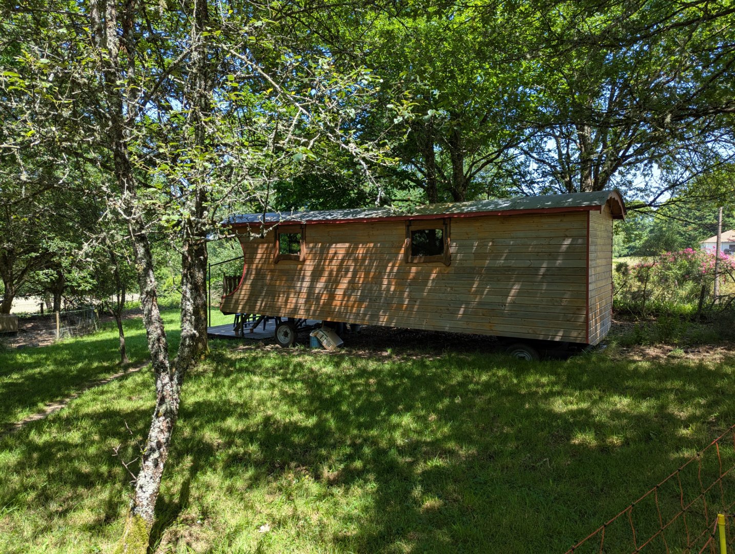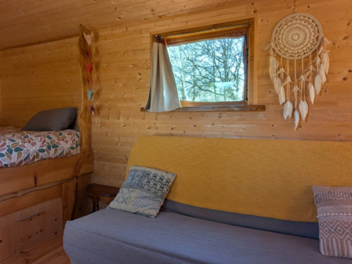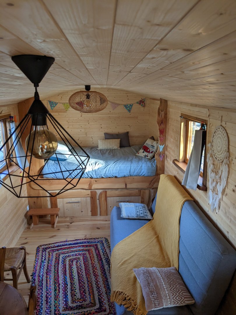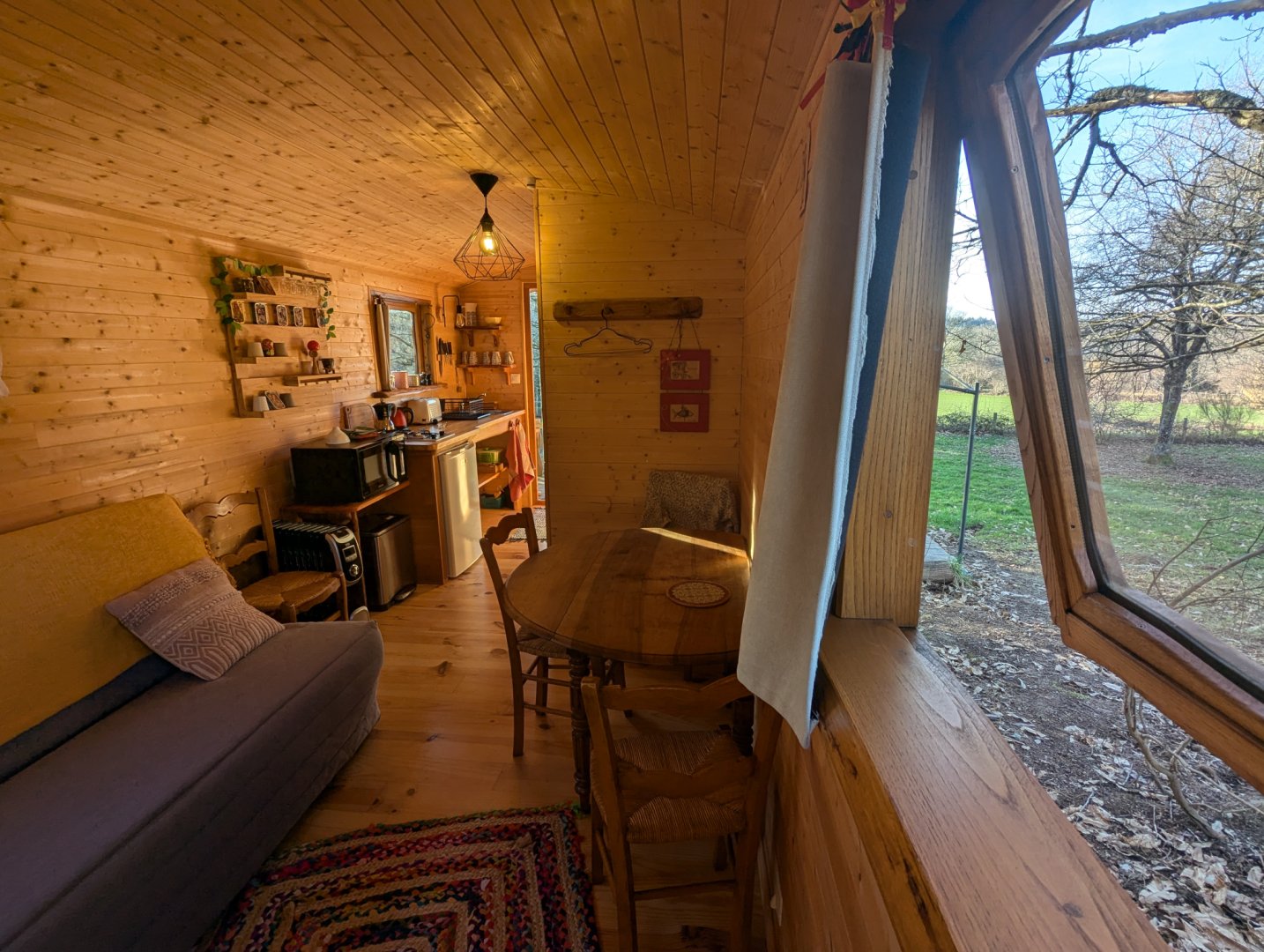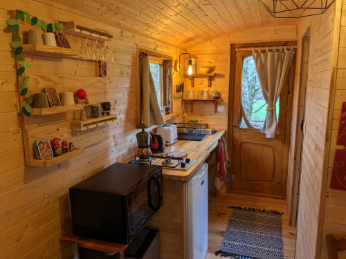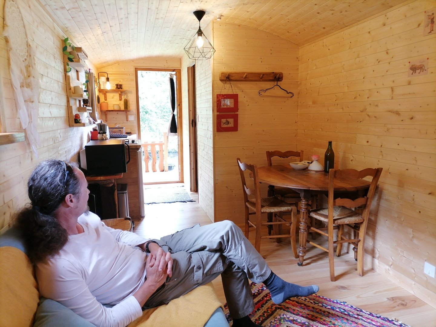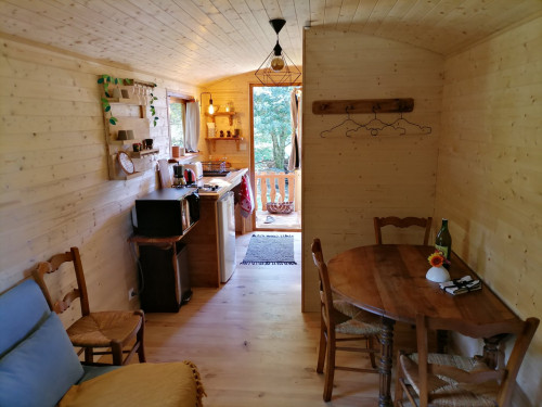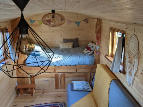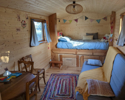 La Roulotte se compose d'une chambre pouvant accueillir 4 personnes (un lit 160x200 et un canapé convertible), d'une cuisine équipée, d'un coin salle à manger, et d'une salle de bain avec toilettes sèches, douche et lavabo.
