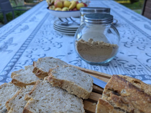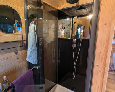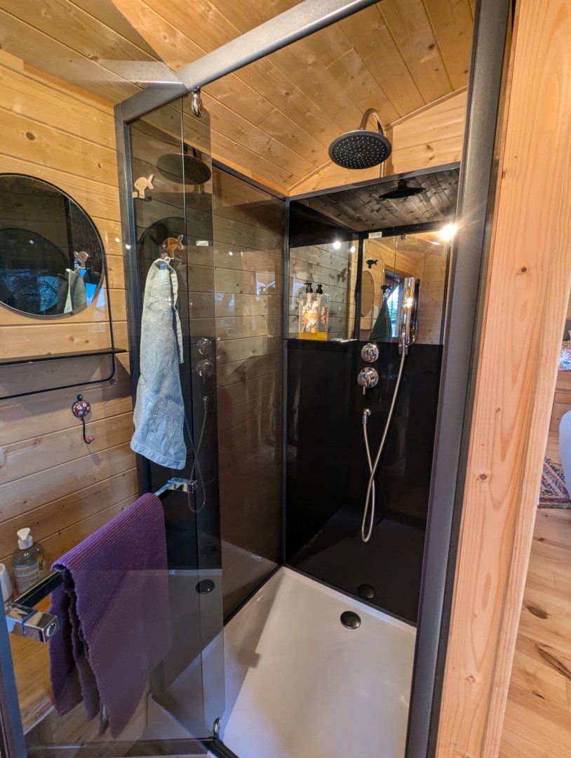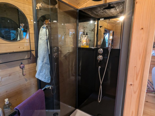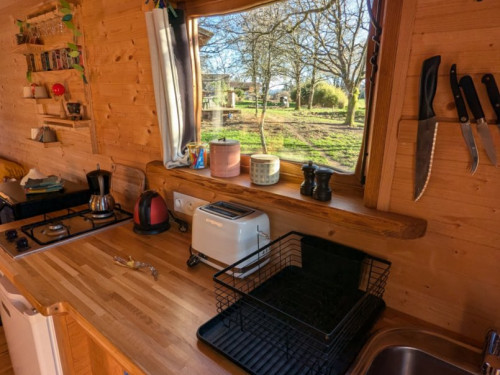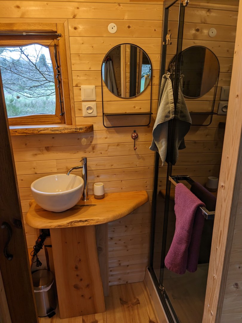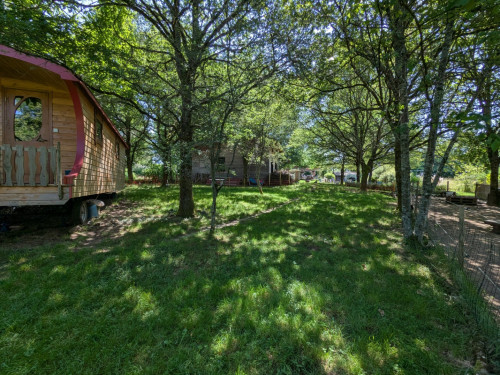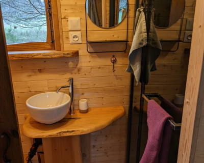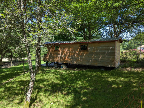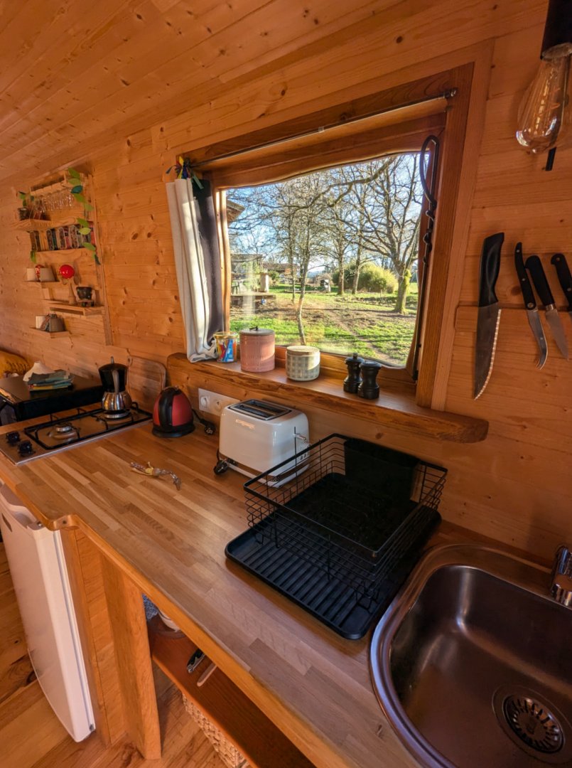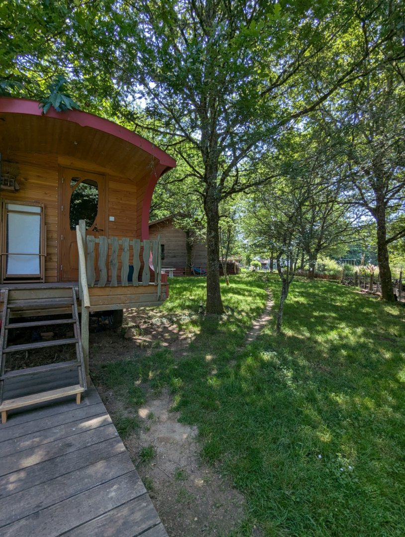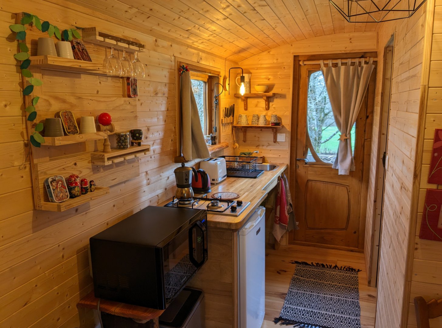 La Roulotte se compose d'une chambre pouvant accueillir 4 personnes (un lit 160x200 et un canapé convertible), d'une cuisine équipée, d'un coin salle à manger, et d'une salle de bain avec toilettes sèches, douche et lavabo.