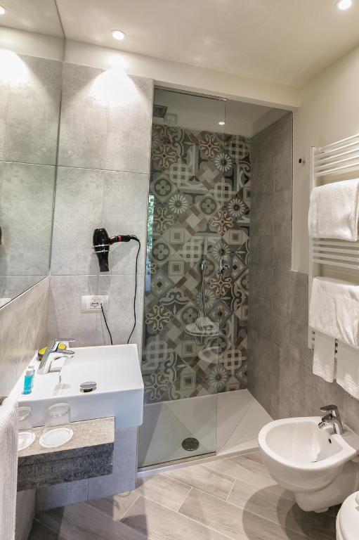 Rooms feature air-conditioning, private bathrooms, tea and coffee makers, bidets, hairdryers, sofa beds, and city views. Amenities include a terrace, kitchenette, washing machine, and dining area.