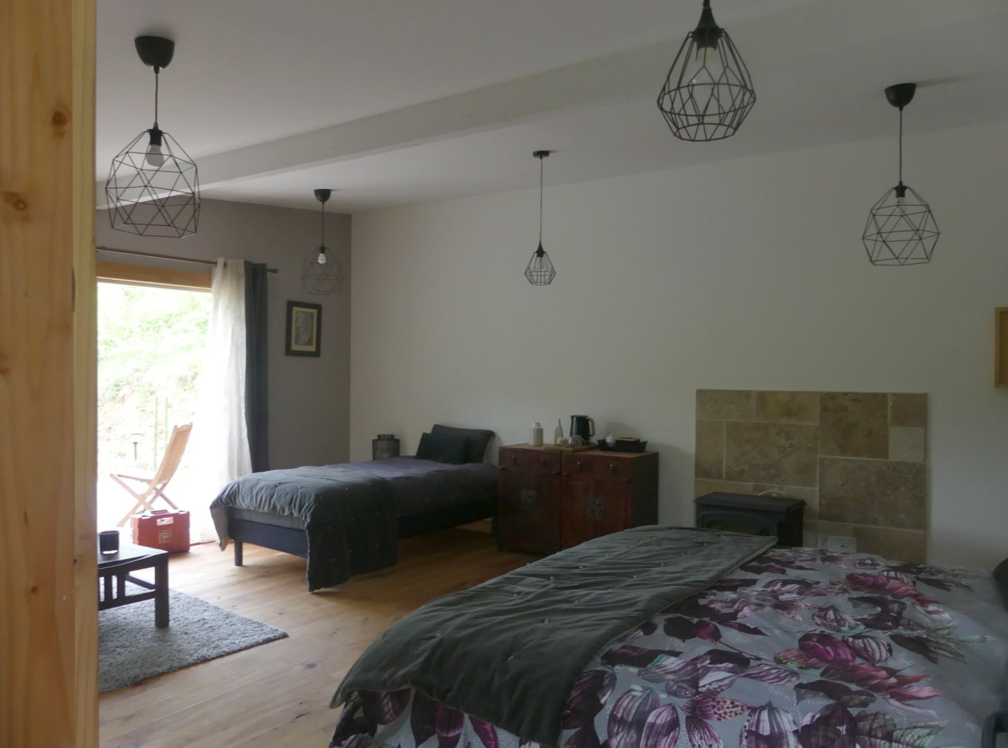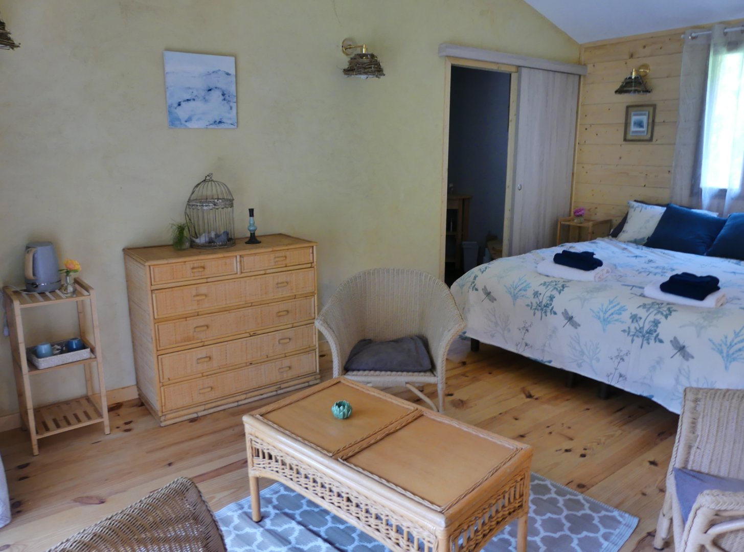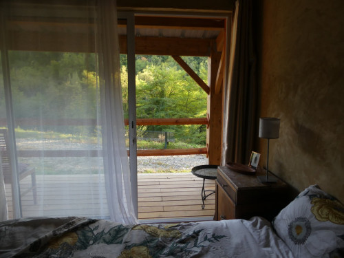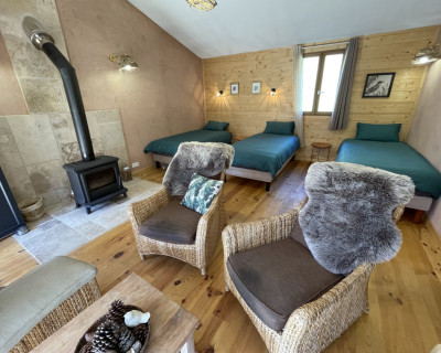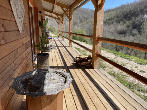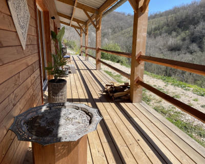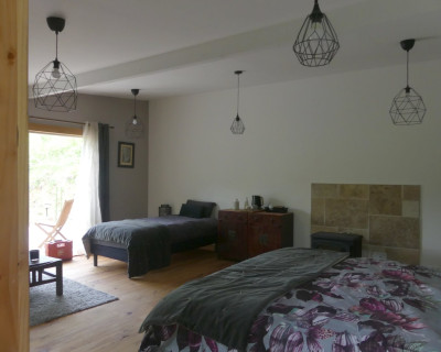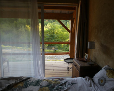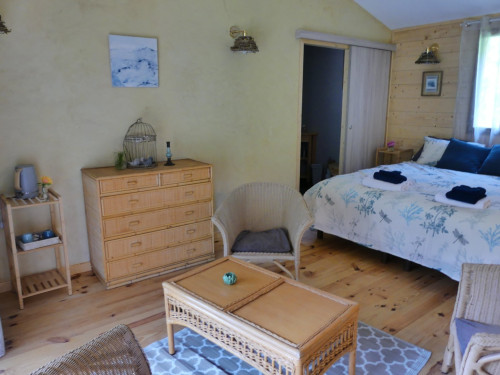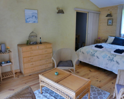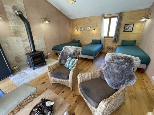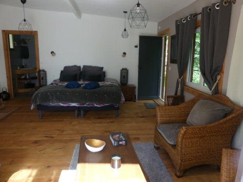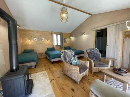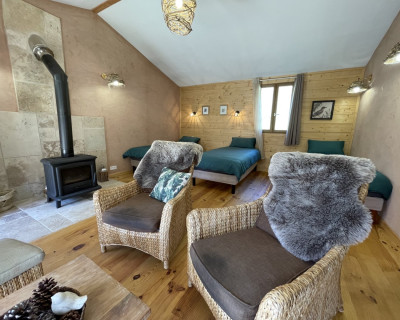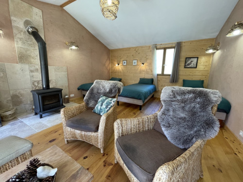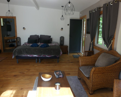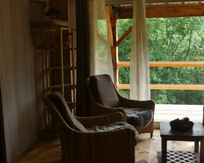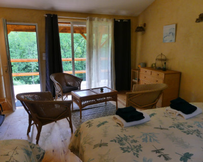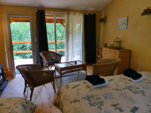 Espace salon avec : fauteuils, table basse, espace tisanerie, grande terrasse privative avec vue sur la nature.