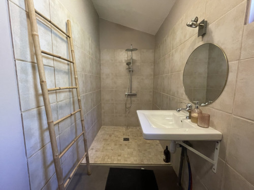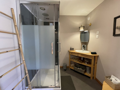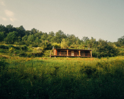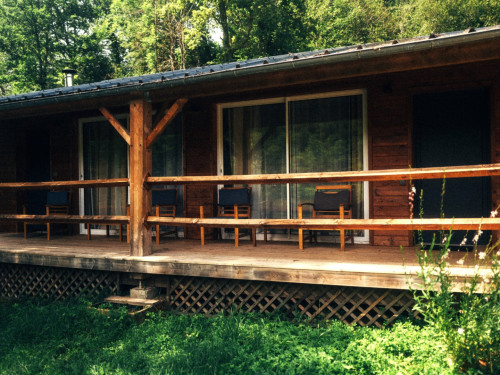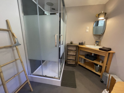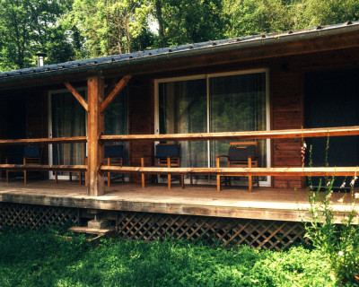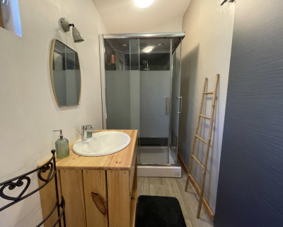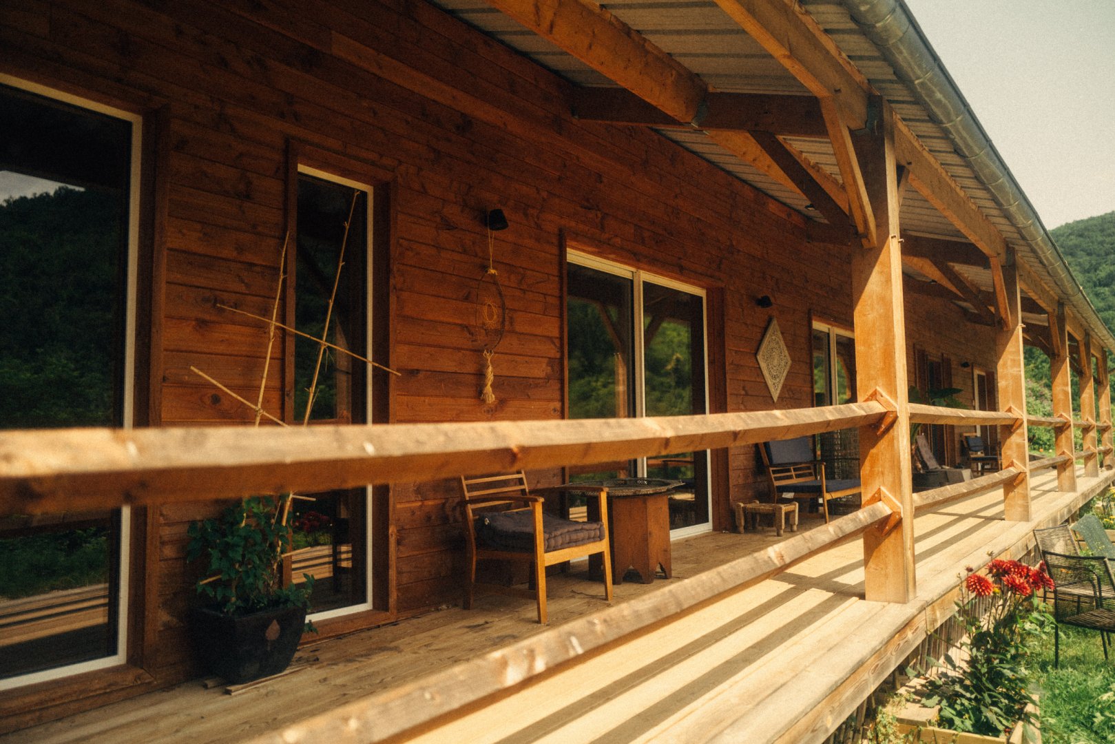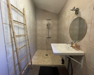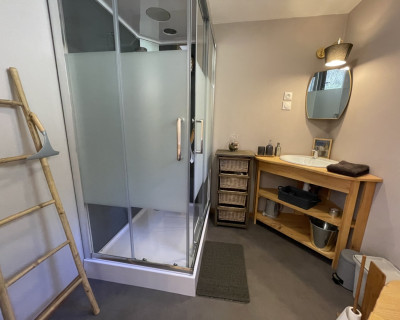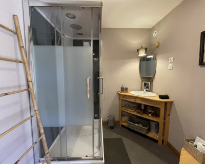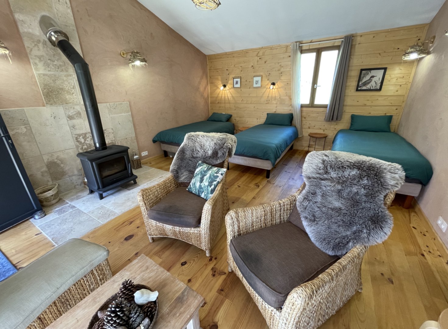 Espace salon avec : fauteuils, table basse, espace tisanerie, grande terrasse privative avec vue sur la nature.