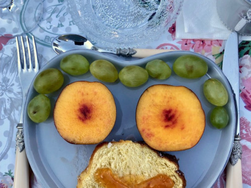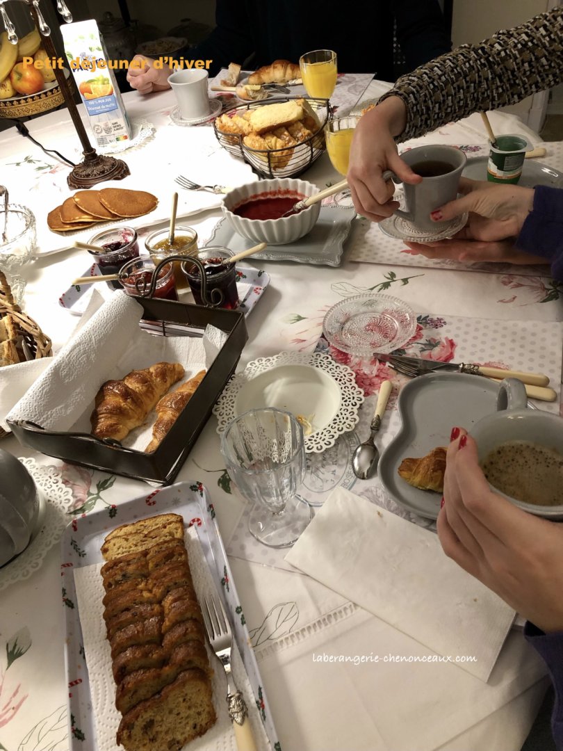 Petit déjeuner très copieux et très bon que nous avons pris dans le jardin.