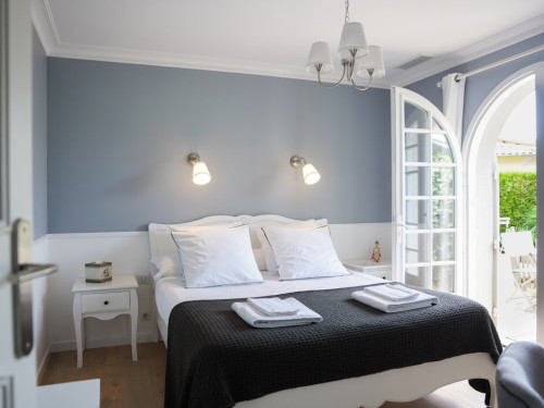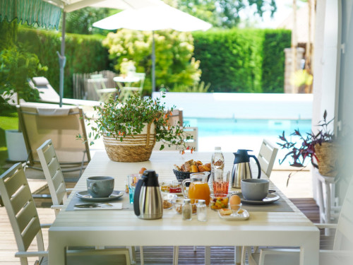 Vous êtes à Andernos-Les-Bains, sur la côte Est du Bassin d'Arcachon, idéalement situé entre Arcachon et le Cap Ferret. La villa Surcouf labellisée Naturellement B'A et Gîtes de France vous accueille au calme d'un quartier résidentiel boisé, à 2 pas des commerces, 5 minutes de la plage, avec accès aux pistes cyclables à 100 mètres de la maison, et arrêt de bus pour Bordeaux ou pour le Cap Ferret à 500 m La Villa Surcouf vous propose 4 chambres d'hôtes de plain-pied avec accès privatif sur un terrain paysagé avec jardin, terrasses bois et piscine. PRESTATIONS : accès Wi-Fi gratuit intérieur et extérieur, piscine chauffée (début mai à fin septembre), location sur place de VTC équipés (panières, kits de réparation, siège bébé), parking à disposition. Chaque suite, équipée de literie neuve et de qualité, comporte : une table bureau, 2 tables de nuit, des placards, un écran TV plat (TNT), un plateau de collation (bouilloire, café, thé, tisane, gâteaux...) un réfrigérateur, une salle de bain (sèche cheveux, radiateurs sèche-serviettes soufflants), des WC, ainsi qu'une terrasse privée à l'extérieur. Les chambres Grand Piquey et Cap Ferret, communicantes par un couloir intérieur, peuvent être louées ensemble et seront idéales pour des vacances en famille ou entre amis. Selon les chambres il est possible d'ajouter avec une participation un lit d'appoint en 80x200 ou un lit bébé. Radiate