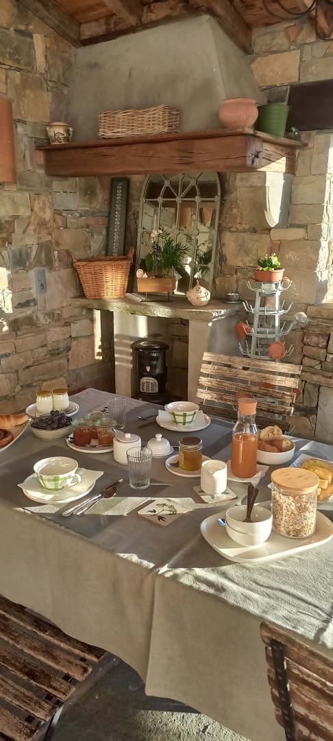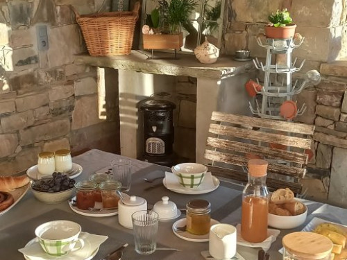 Petit déjeuner gourmand fait maison servi sous l'appenti ou dans la salle à manger familiale en fonction de la météo.